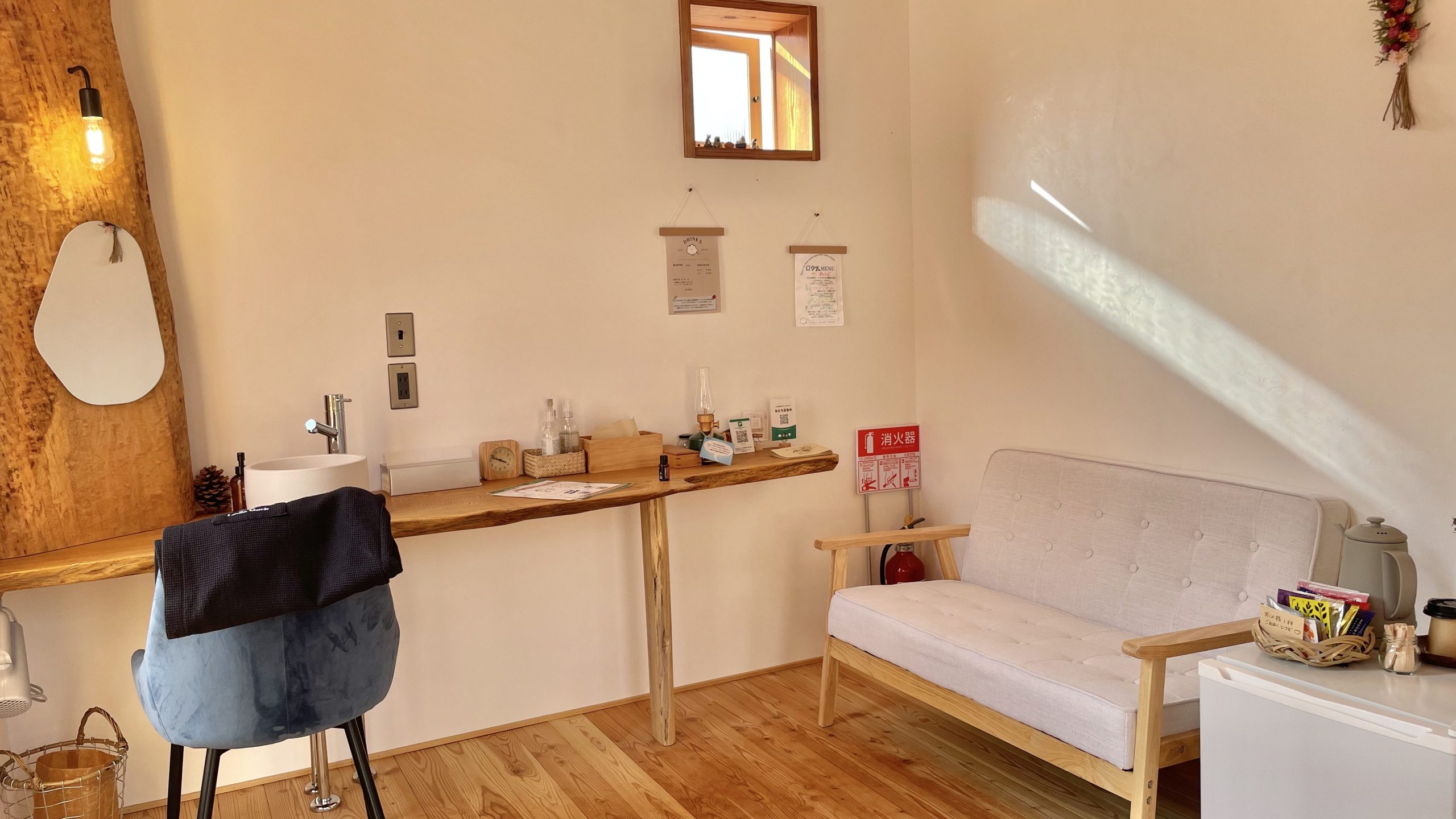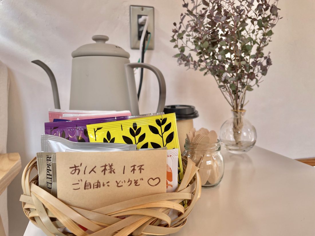 お部屋の中には洗面台やドライヤーの他に、コーヒーやお茶などのパック、読書できる本なども。