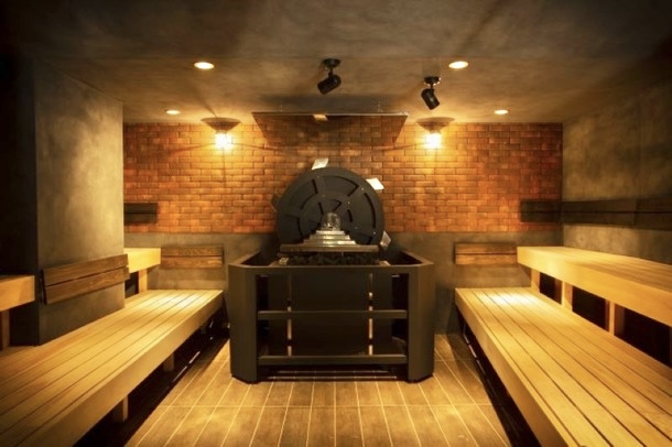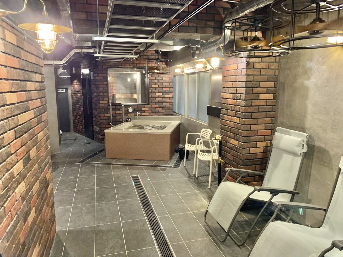 内気浴スペースは配管が剥き出しで無機質な雰囲気がかっこいい!