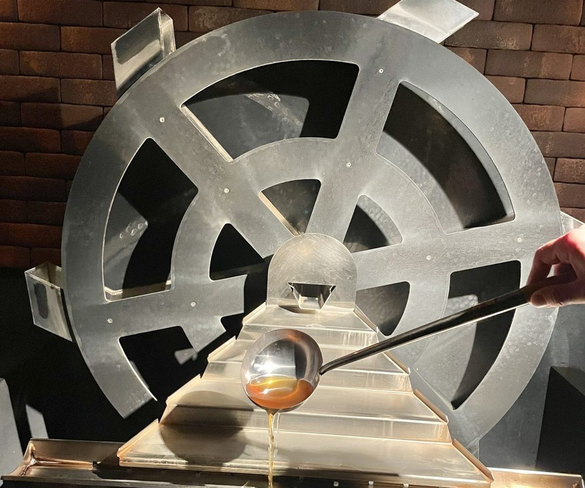 オートロウリュの時間になると、水車が逆回転し、底に溜まった水を掬い上げてサウナストーンに水を注ぐ仕組み。