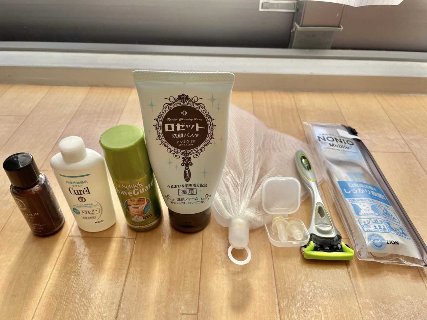 私は、洗顔料、洗顔ネット、シャンプー、ボディソープ、ひげ剃り、シェービング、耳栓を中に入れてます。