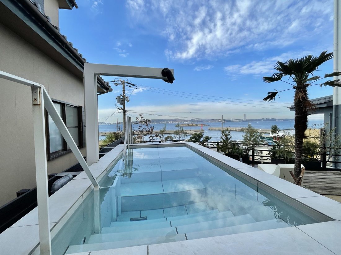 目の前には広大な海と青空が広がり、水風呂に入りながら絶景を楽しめますよ。